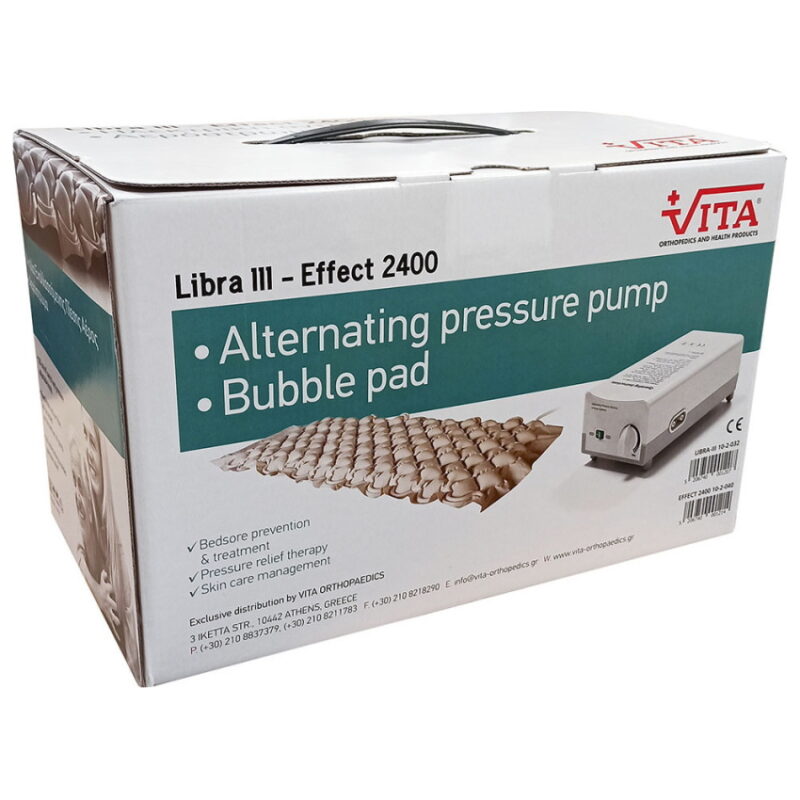 Το Κυψελωτό Αερόστρωμα Κατάκλισης σετ με Αντλία «LIBRA IΙΙ» Effect 2400 10-2-071 Vita, είναι σύστημα πρόληψης και θεραπείας του δερματικού έλκους λόγω κατάκλισης, με εναλλασσόμενη ροή αέρος. Μικρού μεγέθους αντλία, αθόρυβη. Ο όγκος του παρεχόμενου αέρα ρυθμίζεται με ηλεκτρικό ροοστάτη. Προστατεύεται από τη σκόνη με εσωτερικό φίλτρο αέρα. Η ηλεκτρική ασφάλεια προστατεύει το μοτέρ από την πτώση της τάσης και το βραχυκύκλωμα. Διαθέτει ένδειξη κανονικής ή χαμηλής πίεσης. Φέρει άγκιστρα στήριξης στη μετόπη του κρεβατιού, καθώς και τέσσερεις βάσεις για τοποθέτηση στο δάπεδο.